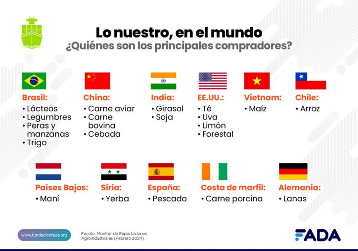 El estudio de FADA también analiza quiénes son nuestros principales compradores: Brasil (lácteos, legumbres, peras y manzanas y trigo), China (carne aviar y de vaca y cebada), India (girasol y soja), EE.UU. (té, uva, limón y forestal), Vietnam (maíz), Chile (arroz), Países Bajos (maní), Siria (yerba), España (pescado), Costa de Marfil (cerdo) y Alemania (lanas).