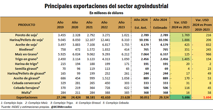 De hecho, considerando los cinco principales complejos del agro (soja, maíz, trigo, girasol y cebada), la proyección de exportaciones para el 2024 perfora los US$ 30.000 millones y se ubica en US$ 29.300 millones. Si bien esto implica una recuperacion de SU$ 5.700 millones, el valor de lo exportado por estos productos quedaría US$ 1.700 millones por debajo del promedio del último lustro.