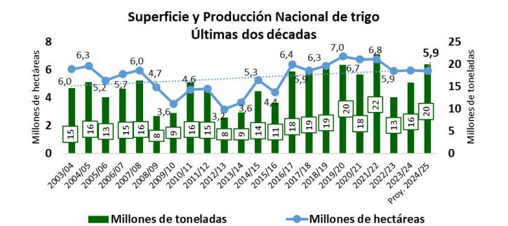 La proyección de siembra para la actual campaña 24/25, replica la superficie del año pasado, 5,9 millones de hectáreas, según intención de siembra relevada a productores agrícolas por la Bolsa de Cereales de Buenos Aires. Los rendimientos proyectados para la 24/25, consideran las lluvias que recargaron el perfil de suelo de la superficie triguera del país, permitiendo simular un promedio nacional semejante al de la campaña récord 21/22, de casi 3,4 toneladas por hectárea, resultando en una proyección de producción nacional 24/25 de 20 millones de toneladas.