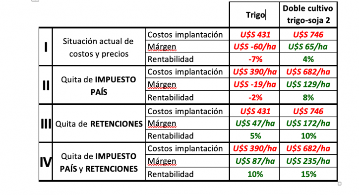 La quita del IMPUESTO PAÍS a los insumos agrícolas, así como la quita de RETENCIONES al trigo, lograría disminuir costos y elevar ingresos respectivamente, aportando competitividad productiva, tanto a zonas donde trigo es el principal cultivo del año, como donde el doble cultivo anual, trigo/soja de segunda compite con cultivos de verano.