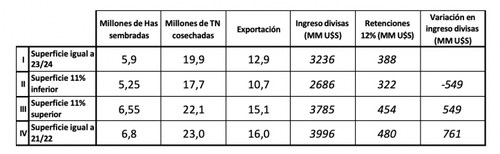 En el siguiente cuadro se simulan cuatro escenarios de superficie de siembra de trigo 24/25, considerando que un cambio en las reglas de juego, que impacten sobre la rentabilidad del trigo, motivará a cambios en la superficie destinada a la siembra de este cultivo.
