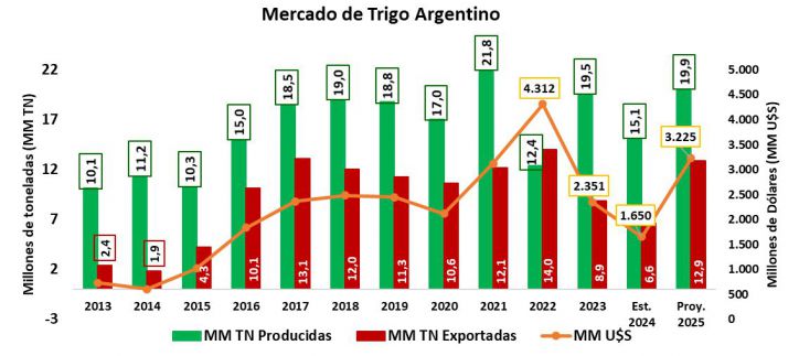 La proyección de siembra para la actual campaña 24/25, replica la superficie del año pasado, 5,9 millones de hectáreas, según intención de siembra relevada a productores agrícolas por la Bolsa de Cereales de Buenos Aires. Los rendimientos proyectados para la 24/25, consideran las lluvias que recargaron el perfil de suelo de la superficie triguera del país, permitiendo simular un promedio nacional semejante al de la campaña récord 21/22, de casi 3,4 toneladas por hectárea, resultando en una proyección de producción nacional 24/25 de 20 millones de toneladas.