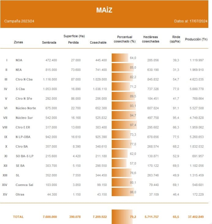 Maíz: la cosecha del cereal se ubica en un 79,2%