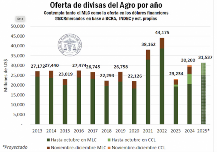 El sector agroindustrial proyecta una liquidación de divisas de US$31.500 millones en 2025, superando en US$1.300 millones los valores de 2024, según la Bolsa de Comercio de Rosario (BCR). Este crecimiento se explica por una mejora en las condiciones climáticas y el mantenimiento del esquema de dólar blend, que podría destinar US$6.300 millones de esas divisas a los dólares financieros.