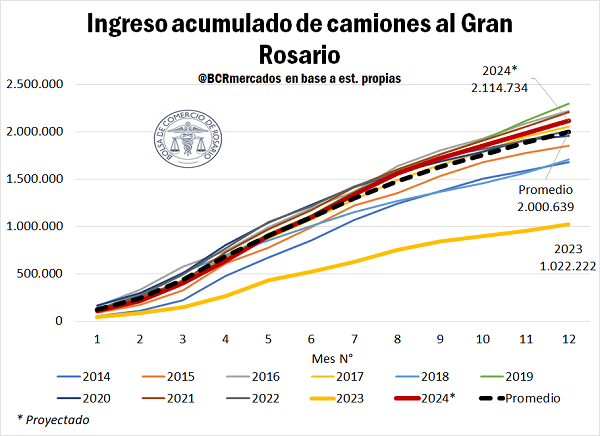 Según un informe de la Bolsa de Comercio de Rosario (BCR), el 92,7% de la carga agropecuaria en Argentina se transporta en camión, representando el 35% del total de las cargas.