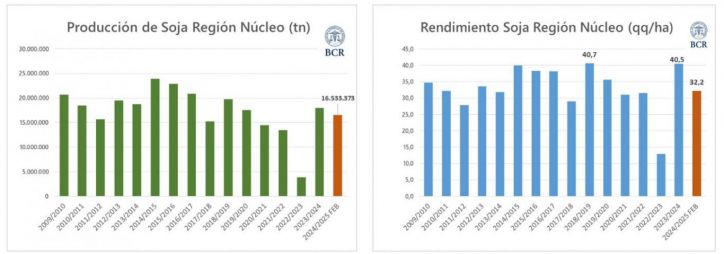 Ante este escenario, la BCR ajustó su estimación para la producción de soja 2024/25 en la zona núcleo a 16,5 millones de toneladas, con un rendimiento promedio de 32,2 qq/ha. «La sequía de enero quebró las expectativas y dejó pérdidas irreversibles», concluyó el informe.