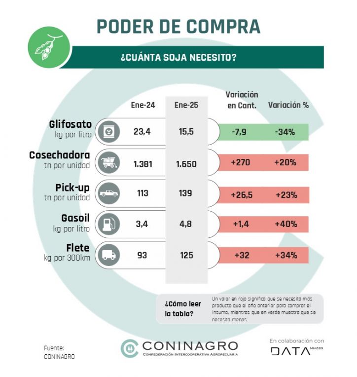 En gran parte, el encarecimiento de los fletes está relacionado al gasoil, insumo frente al que los granos también perdieron poder de compra. En enero de 2025 se necesitaron 40% más de kilos de soja para pagar un litro de gasoil que en enero de 2024.