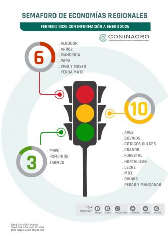CONINAGRO pública este indice para que los productores agropecuarios puedan hacer un seguimiento de los indicadores que se analizan. Mira en detalle el INFORME de las economías regionales monitoreadas por el área de Economía de CONINAGRO, con cifras que surgen del análisis realizado durante el mes de Enero de 2025. El «Semáforo de Economías Regionales» busca simplificar la complejidad y heterogeneidad de la producción en el campo hacia una herramienta visual de análisis.