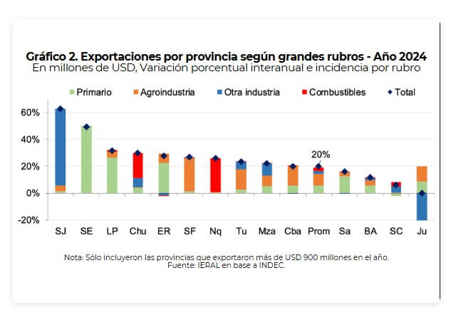 El IERAL destaca que el crecimiento de 2024 fue del 20% interanual, traccionado por el sector primario (+26%) y las manufacturas agroindustriales (MOA, +24%). Las frutas frescas (+11%), las bebidas alcohólicas (+11%) y los productos lácteos (+6%) marcaron subas relevantes.