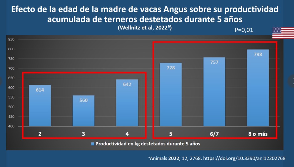 Un trabajo publicado por investigadores de la Universidad de Montana en el 2022 reportó el impacto de la edad de la madre en la productividad de sus hijas. La producción acumulada de terneros destetados durante 5 años fue mayor en vacas hijas de madres con 5 años o más que en las hijas de madres más jóvenes. Este trabajo proporciona una evidencia más de las ventajas para el sistema de tener vacas con la habilidad de mantener la aptitud física y reproductiva en ambientes nutricionales limitados mientras continúan destetando terneros año tras año.