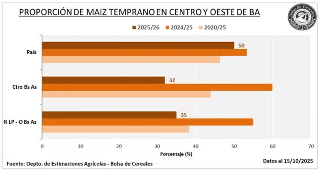 La participación de la siembra temprana dentro del total sembrado se ajusta a la baja: en el oeste bonaerense, la estimación cayó del 44 % previsto en septiembre al 35 %, mientras que en el Centro de la provincia pasó del 59 % al 32 %.