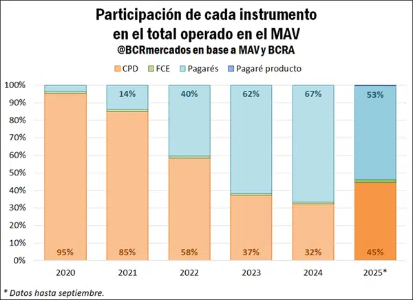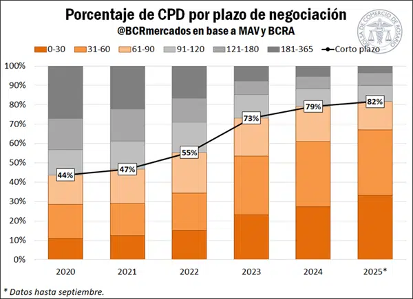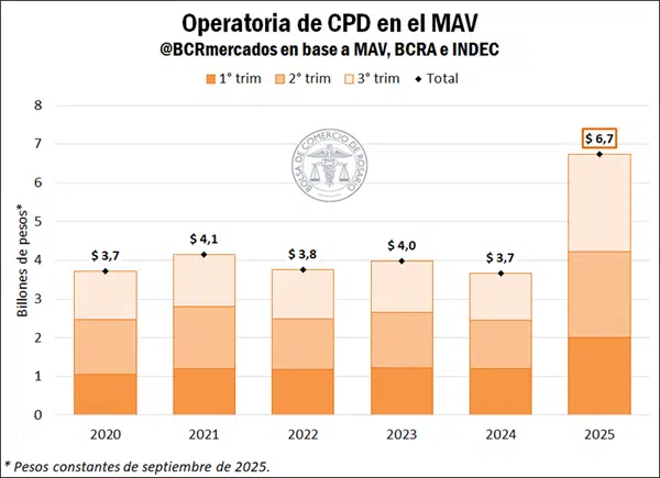 CPD: fueron los grandes protagonistas del año. Con $6,7 billones operados (+84% interanual), ganaron participación y en septiembre marcaron su propio récord con $1,1 billones negociados en un solo mes. Predominaron los plazos cortos (hasta 60 días), que representaron más del 67% de las operaciones.