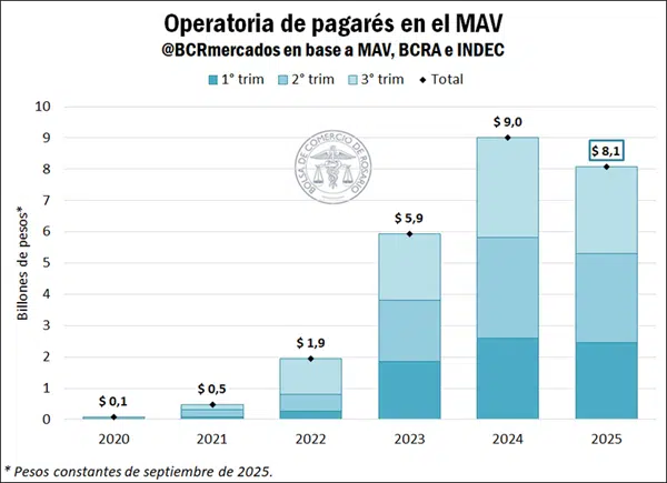 Pagarés: continúan siendo el instrumento más utilizado, con $8,1 billones operados entre enero y septiembre. Sin embargo, pierden peso frente a 2024: pasaron de concentrar el 67% del total al 53%, con una caída de más del 10% interanual.