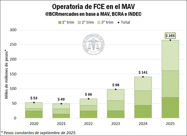 Facturas de crédito electrónicas (FCE): aunque con menor peso, registraron el mayor salto relativo (+89% interanual), alcanzando $265.000 millones en lo que va del año.