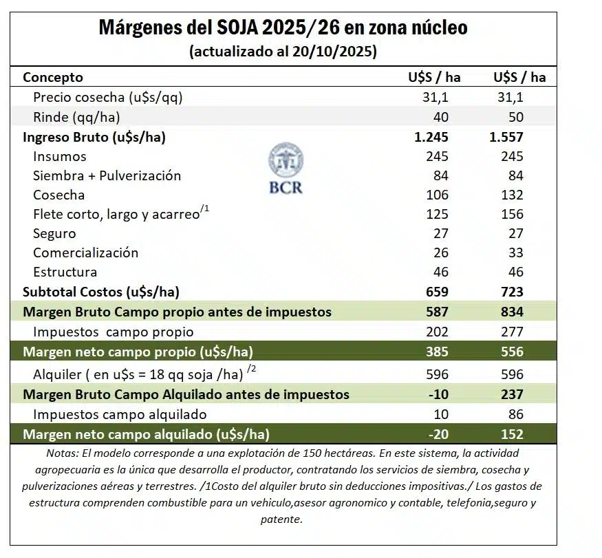 En comparación con un año atrás, la “foto” económica es más alentadora. Tomando un rinde de 40 qq/ha, los márgenes se ubican en 97 u$s/ha en campo propio y 87 u$s/ha en campo alquilado. Según la última actualización del 20 de octubre, la rentabilidad neta alcanza 385 u$s/ha en campo propio, pero cae a -20 u$s/ha bajo arrendamiento, considerando un precio a cosecha de 311 u$s/tn.