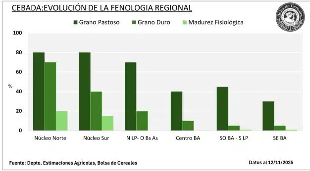 En la provincia de Buenos Aires, los lotes muestran un estado general positivo y se esperan rindes por encima del promedio histórico, incluso en zonas donde hubo daños asociados a eventos climáticos. Por su parte, en los núcleos cebaderos del Sur, el cultivo mantiene una muy buena condición, con pérdidas mínimas por heladas y con evaluaciones que, hasta el momento, no modifican las expectativas de productividad.