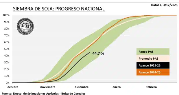 La Bolsa de Cereales informó que, tras un avance intersemanal de 8,7 puntos porcentuales, la siembra de soja alcanzó el 44,7% de las 17,6 millones de hectáreas proyectadas para la campaña 2025/26. A pesar del impulso en las labores, el progreso mantiene una demora interanual de 9 puntos porcentuales respecto de la campaña previa y se ubica 1,1 punto por debajo del promedio de las últimas cinco campañas.