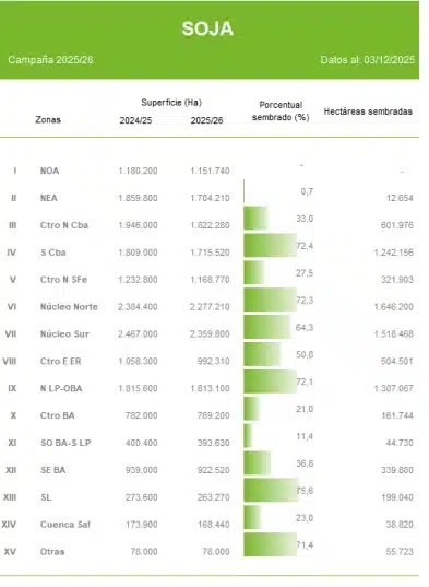 La siembra de soja logró un avance semanal de 8,7 puntos porcentuales y ya cubre el 44,7% de las 17,6 millones de hectáreas previstas para la campaña 2025/26. Sin embargo, el ritmo sigue por detrás del año pasado y del promedio histórico, con demoras marcadas en el centro bonaerense por problemas de piso.