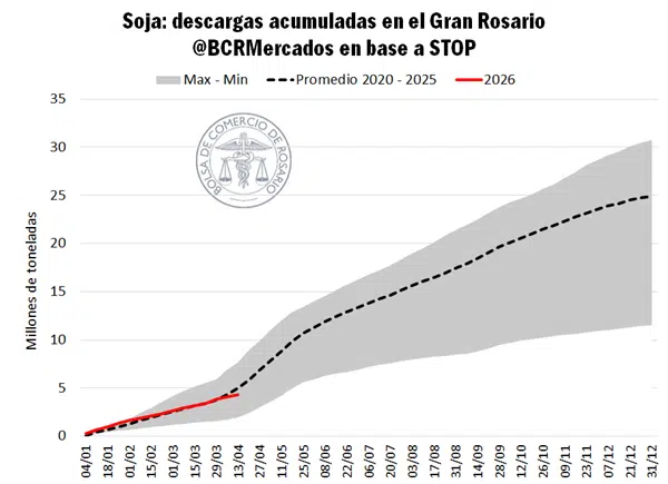 El escenario local muestra una fuerte tensión entre oferta y logística. A pesar de que la recolección viene retrasada —con apenas el 25% del área cosechada frente al 55% promedio—, el ingreso de camiones a los puertos del Gran Rosario es récord. En lo que va del año, ya se descargaron 18,8 millones de toneladas de granos, un 30% más que el promedio histórico para esta época.