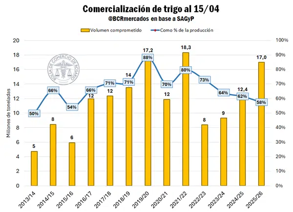 En paralelo, el trigo argentino 2025/26 muestra una dinámica comercial activa. Ya se comprometieron 17 millones de toneladas, un volumen que marca un hito en términos históricos recientes.