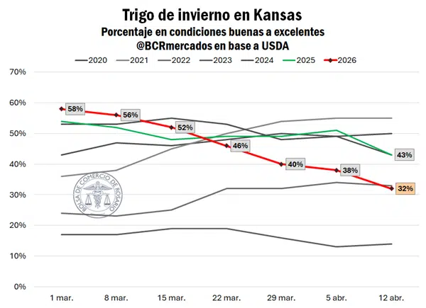Además, solo el 34% presenta condiciones buenas a excelentes, lo que marca un deterioro significativo. Estados clave como Kansas, Texas y Oklahoma registran caídas sostenidas en la calidad de los cultivos.
