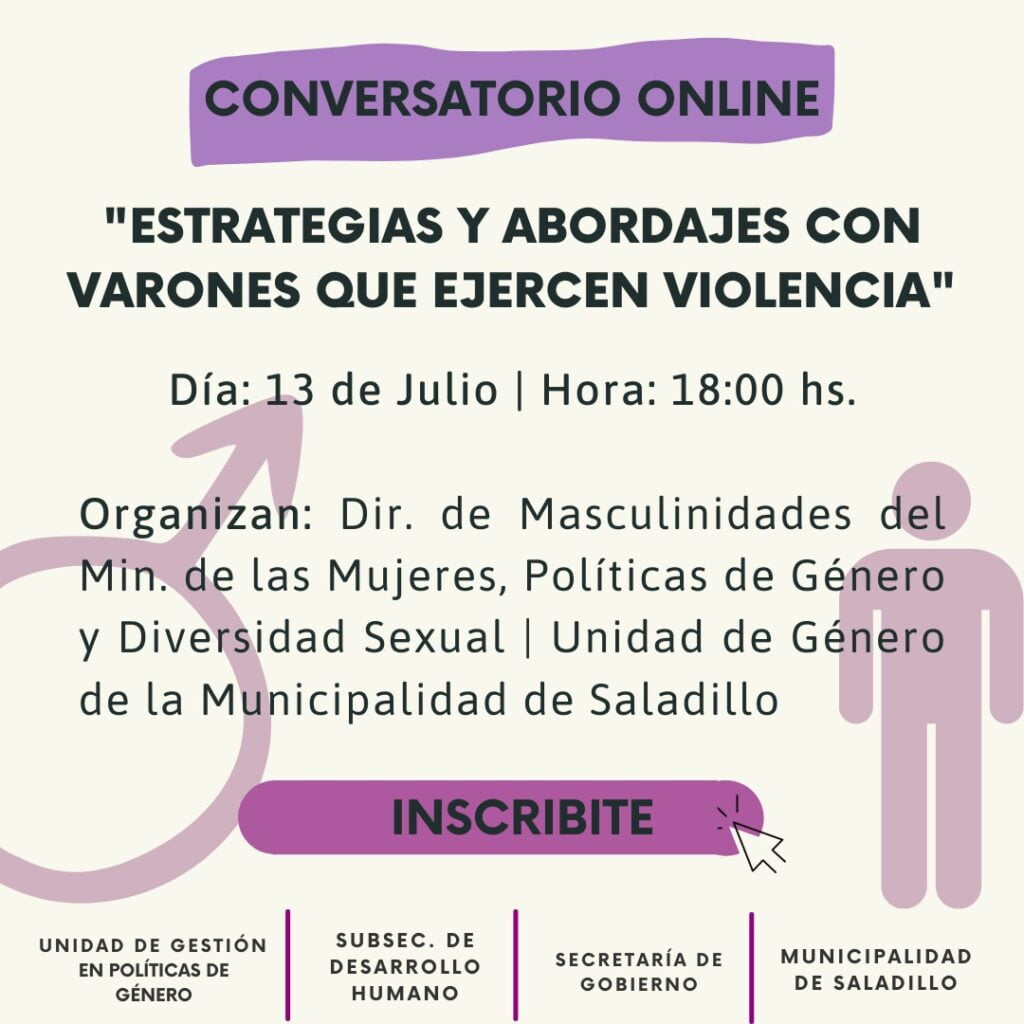 La Unidad de Gestión en políticas de Género dependiente de la Subsecretaria de Desarrollo Humano de la Municipalidad de Saladillo, invitan a profesionales y trabajadores de salud, educación, justicia y sociales, al primer conversatorio online sobre “Estrategias y Abordajes con Hombres que Ejercen Violencia”, a desarrollarse de manera conjunta con la Dirección de Masculinidades, perteneciente al Ministerio de las Mujeres, Políticas de Género y diversidad Sexual de la Provincia de Buenos Aires. El mismo tendrá lugar el próximo 13 de julio de manera virtual, a partir de las 18:00 horas. El objetivo de este encuentro es profundizar en la deconstrucción de prácticas profesionales al momento de trabajar, o abordar problemáticas, con varones que ejercen violencia, compartiendo experiencias que permitan reflexionar y dotar de nuevos sentidos estas prácticas. Si estás interesado en participar, envianos tu mail por mensaje privado a través de nuestras redes o completá el siguiente formulario: https://forms.gle/iFpdGvtSSzo6ZgFh7