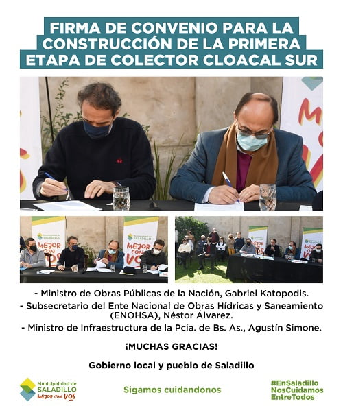 – Ministro de Obras Públicas de la Nación, Gabriel Katopodis.- Subsecretario del Ente Nacional de Obras Hídricas y Saneamiento (ENOHSA), Néstor Álvarez.- Ministro de Infraestructura de la Pcia. de Bs. As., Agustín Simone.