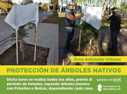 Dicha tarea se realiza todos los años, previo al período de heladas, tapando árboles jóvenes con friselina o bolsas, dependiendo cada caso.