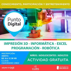 Por otro lado, en la Sede de Punto Digital que se encuentra en el C.U.R.S., se dictan Cursos presenciales de: Informática, Excel, Impresión 3D, Robótica y Programación de Videojuegos.