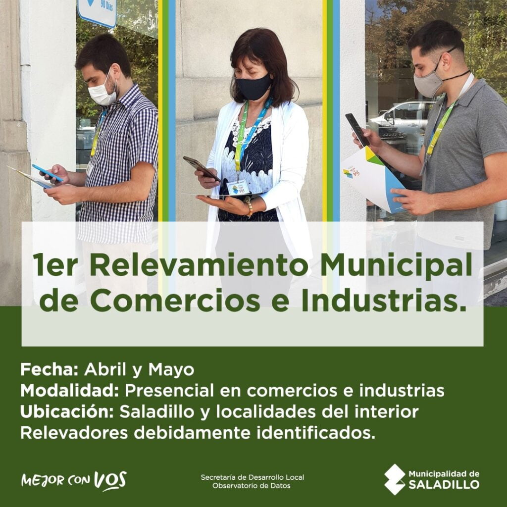 Si tenés un comercio o industria con local a la calle en nuestra ciudad, en estos días, vas a estar recibiendo la visita de encuestadores de la Municipalidad de Saladillo. Te pedimos que nos ayudes respondiendo las preguntas que te hagan.La información que recolectemos será de gran utilidad para la comunicación directa con la Secretaría de Desarrollo Local y el diseño de nuevas políticas para el área.