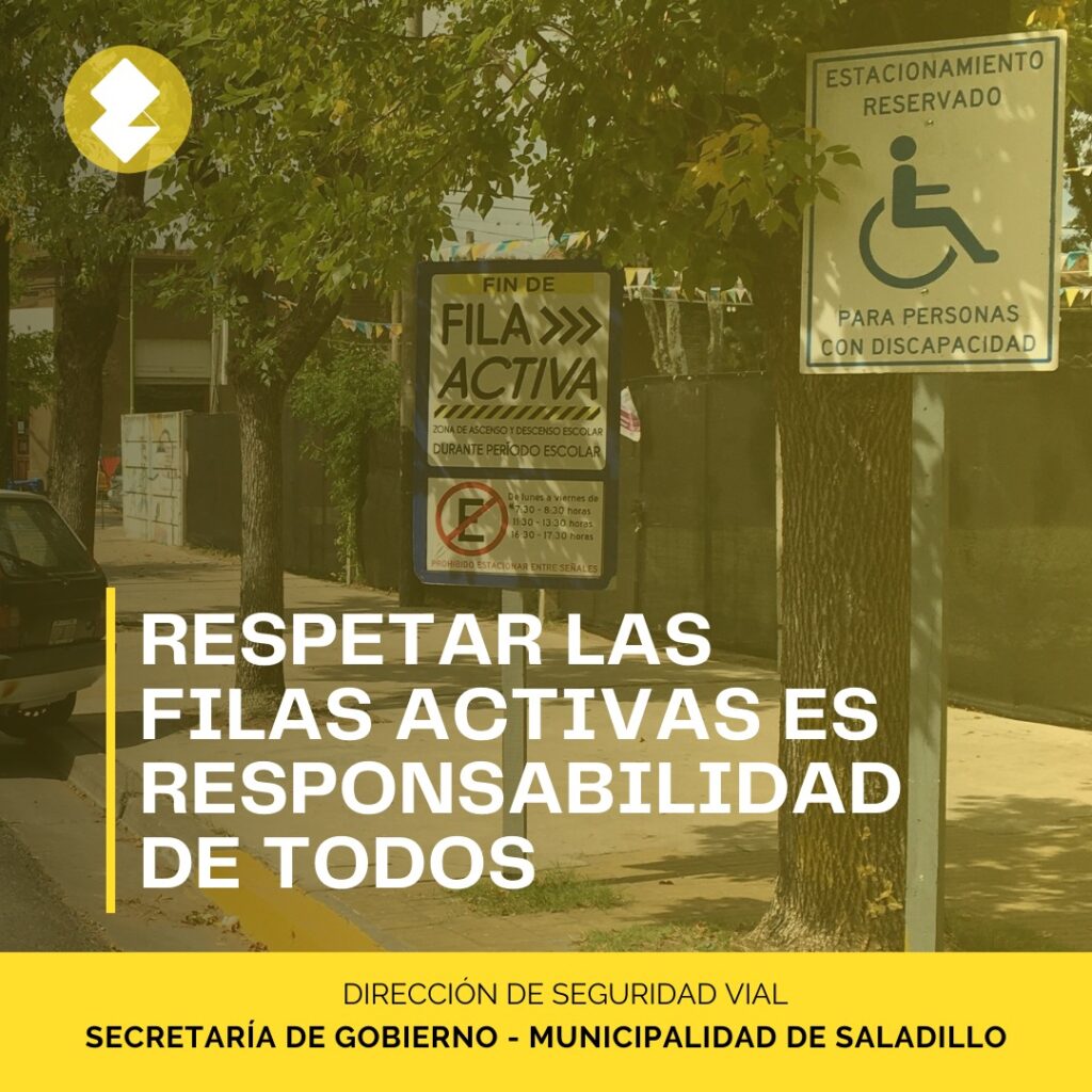 Desde la Dirección de Seguridad Vial de la Municipalidad de Saladillo, informamos a toda la comunidad que ya se encuentran en funcionamiento las “Filas Activas” en los establecimientos educativos de nuestra ciudad. Esto significa que queda prohibido estacionar en las zonas demarcadas en los horarios establecidos en la cartelería.Las Filas Activas con que cuenta Saladillo actualmente están ubicadas en la Escuela Primaria N° 1, la Escuela Primaria N° 18, la Escuela Primaria N° 26 y el Instituto Niño Jesús. Su objetivo es contribuir a la circulación vehicular de una manera ordenada, priorizando la seguridad de los niños y niñas que concurren a dichas instituciones.Un tránsito más seguro es responsabilidad de todos. Hacé tu parte cumpliendo las normas viales y respetando a los Inspectores de Tránsito. Reducí la velocidad en zonas escolares, instituciones recreativas y clubes deportivos y recordá que el peatón siempre tiene prioridad en las esquinas.